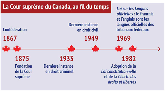 La Cour suprême du Canada est unique au monde : en plus d’être bilingue, elle est le seul tribunal de dernière instance bijuridique, c’est-à-dire qu’il y coexiste les deux traditions juridiques coloniales du pays, soit la common law d’Angleterre et le droit civil de France.