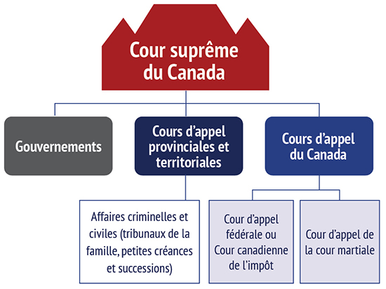 Le plus haut tribunal du pays est nourri par les diverses instances judiciaires du Canada et des Provinces.